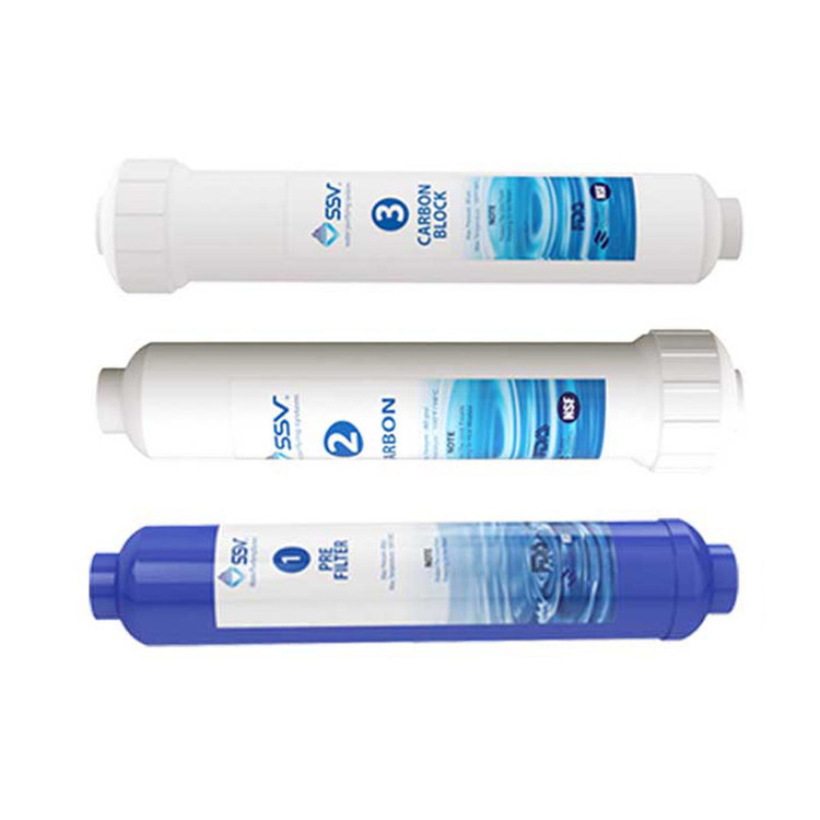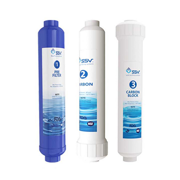 شرکت SSV برای سهولت در خرید شما پک های 3 عددی inline را برای دستگاه های خطی روانه بازار کرده است که شامل یک عدد فیلتر پلی پروپلین، یک عدد فیلتر شارژپذیرکربن اکتیو و یک عدد فیلترشارژپذیر کربن بلاک است. فیلتر تصفیه کننده پلی پروپیلن با دقت بالا و خاصیت متخلخل منصر به فرد خود املاح نامحلول در آب را حذف می نماید. فیلتر کربن اکتیو ساخته شده از پوست بادام پسته و هلو و نارگیل کلیه گازهای نامحلول در آب از جمله کلر را حذف می نماید. فیلتر کربن بلاک با خاصیت چسبندگی مواد کربنی موجود در آب را حذف می نماید. این فیلترها دارای مکانیزم هوشمندانه ای هست که از بازگشت آب از مسیر فیلتر جلوگیری می نماید که موجب افزایش عمر و راندمان آن میگردد. به همین خاطر می بایست هنگام نصب این فیلتر به جهت جریان مشخص شده بر روی آن توجه نمایید. شارژپذیری این فیلترها باعث کاهش چشم گیر هزینه های نگهداری دستگاه می گردد که میتوانید در زمان تعویض فیلترها از شارژ آن ها استفاده نمایید و فیلترها را مجدد شارژ نمایید.