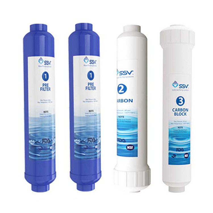 شرکت SSV برای سهولت در خرید شما پک های 4 عددی inline را برای دستگاه های خطی روانه بازار کرده است که با توجه به عمر سه ماهه فیلتر یکم و شش ماهه فیلترهای دوم و سوم شامل دوعدد فیلتر پلی پروپلین، یک عدد فیلتر شارژپذیرکربن اکتیو و یک عدد فیلترشارژپذیر کربن بلاک است. فیلتر تصفیه کننده پلی پروپیلن با دقت بالا و خاصیت متخلخل منصر به فرد خود املاح نامحلول در آب را حذف می نماید. فیلتر کربن اکتیو ساخته شده از پوست بادام پسته هلو و یا نارگیل صد رد صد گیاهی کلیه گازهای نامحلول در آب از جمله کلر را حذف می نماید. فیلتر کربن بلاک با خاصیت چبندگی مواد کربنی موجود در آب را حذف می نماید. این فیلترها دارای مکانیزم هوشمندانه ای هست که از بازگشت آب از مسیر فیلتر جلوگیری می نماید که موجب افزایش عمر و راندمان آن میگردد. به همین خاطر می بایست هنگام نصب این فیلتر به جهت جریان مشخص شده بر روی آن توجه نمایید. شارژپذیری این فیلترها باعث کاهش چشم گیر هزینه های نگهداری دستگاه می گردد که میتوانید در زمان تعویض فیلترها از شارژ آن ها استفاده نمایید و فیلترها را مجدد شارژ نمایید.