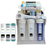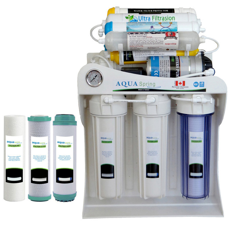 دستگاه تصفیه کننده آب آکوآ اسپرینگ مدل UF - SF4800 به همراه فیلتر تصفیه آب کد 01 مجموعه 3 عددی با برند معتبر اکوآاسپرینگ مجهز به مکانیزم دوگانه مدل UF - SF4800 ده مرحلهای و دارای باکیفیتترین و بروزترین تکنولوژی در فرایند دستگاههای تصفیهآب خانگی است. آب شرب دارای مقادیر زیادی املاح و آلودگی است. این آلودگیها قابل رویت نیستند بلکه فقط با آزمایش تشخیص داده میشوند. بههمین علت اخیرا استفاده از دستگاهای تصفیهآب خانگی در کشورمان بهیک امر ضروری مبدل شده است چراکه آب آلوده منشاء اصلی اکثر بیماریهاست.این دستگاه از متریال و هوزینگهای فودگرید، فیلترهایی برپایه گیاهی، مخزن آنتیباکتریال 16 لیتری، مگابوستر پمپ قوی بافشار 125 PSI و شیر جداگانه برخوردار است. عملکرد فیلترهای این دستگاه در سهمرحله اول بهاینصورت است که کلیه املاح معلق و مضر، کلر، آفتکشها و شوری را از آب گرفته و درمرحله بعد نیترات، نیتریت، جیوه و میکروارگانیسمهای شیمیایی و فلزات سنگین (کلیه املاح سرطان زا) را بهطور کامل از آب میگیرد.