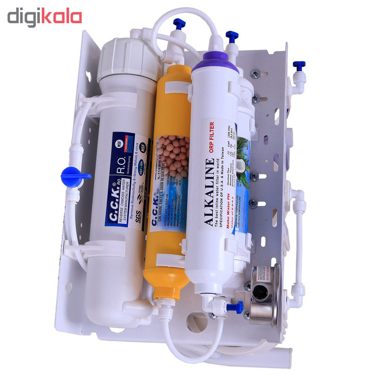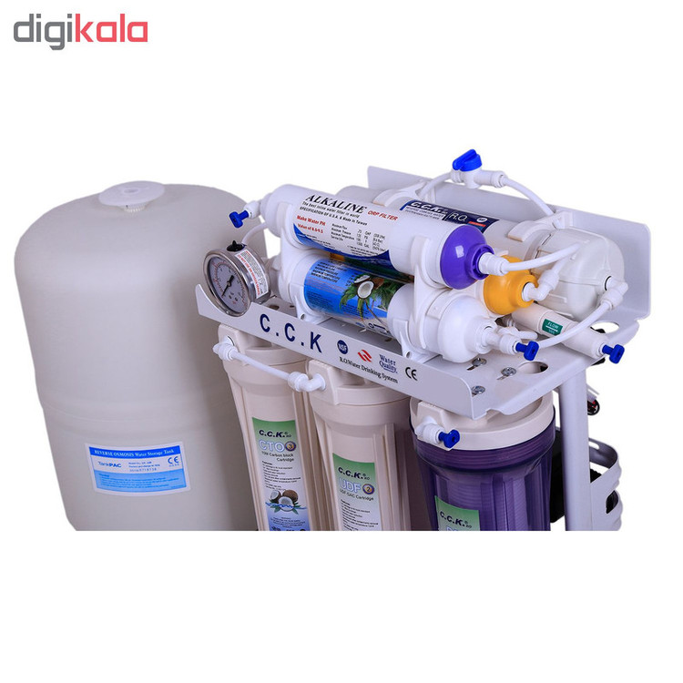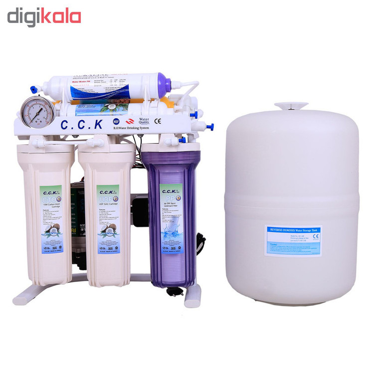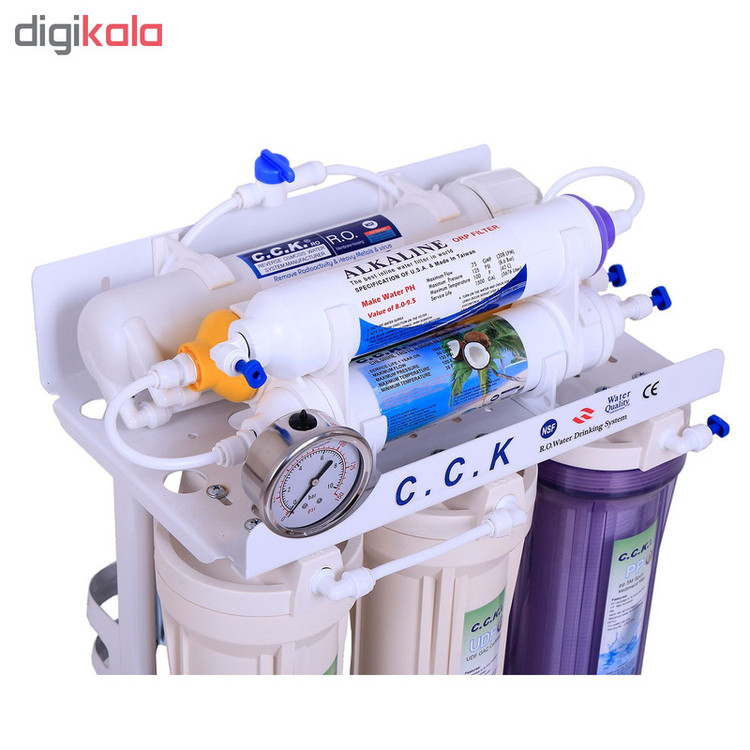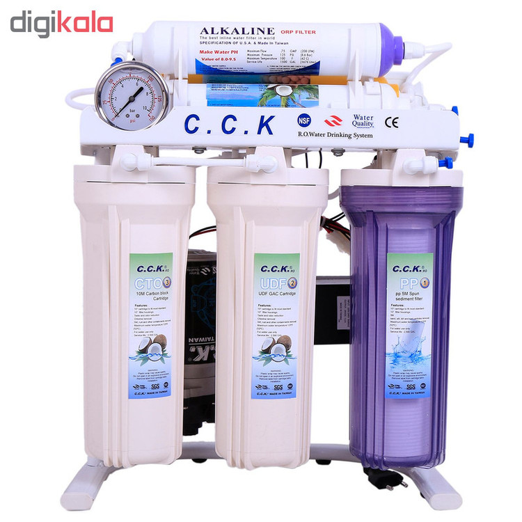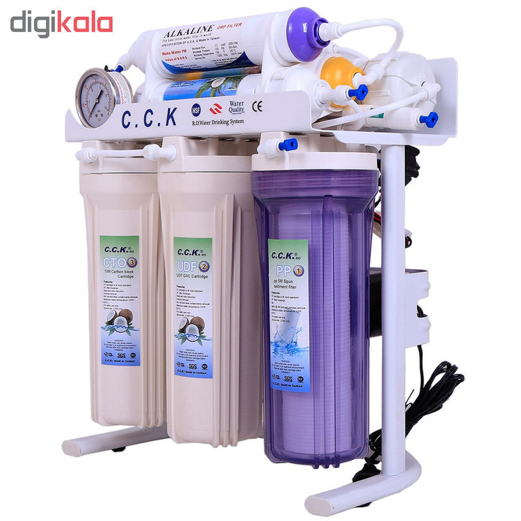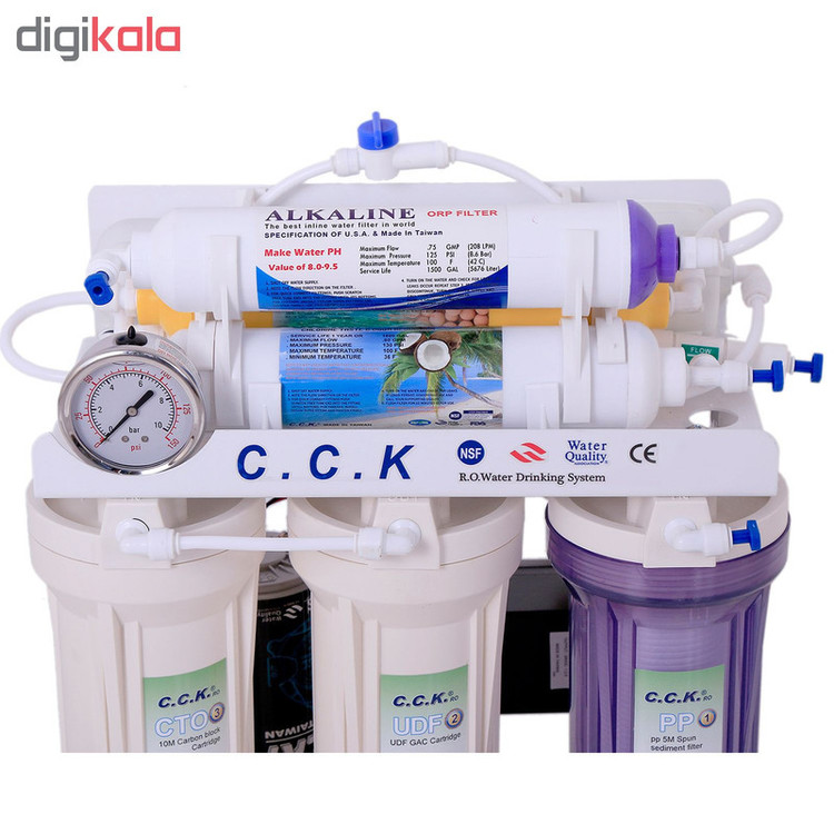 آب تصفیه کن خانگی سی سی کا با تکنولوژی اسمز معکوس یا همان RO و قلیایی کننده آب با استفاده از 7 فیلتر مجزا یک دستگاه کامل و مناسب هر منطقه یا شهری میباشد، تصفیه آب خانگی CCK تایوانی یکی از بهترین انتخاب های شما میتواند باشد که قابلیت خواص آنتی اکسیدانی و قلیایی کننده آب را داراست و همچنین دارای قدرت حذف فلزات سنگین آب مثل نیترات و نیتریت می باشد، فیلتر مرحله چهارم ممبران 13 لایه فیلم تک میباشد که قابلیت حذف سختی آب را دارد و استاندارد های جهانی FDA ،WATER QUALITY ،CE ،NSF را دارا میباشد، این دستگاه به غیر از 7 مرحله و 7 فیلتر دارای پمپ، ترانس، های پرشر، لو پرشر، شیر برقی، شیر میکس، مخزن 4 گالن 16 لیتری تانک پک، گیج فشار و کلیه لوازم نصب و شیر برداشت نیمه اهرمی میباشد، سی سی کا جزو بهترین برندهای تصفیه آب خانگی میباشد که ساخت کشور تایوان تحت لیسانس آمریکا است، این دستگاه پمپ قوی 125psi بدون صدا و لرزش دارد و با برق (24 ولت) کار میکند و قابلیت نصب به ساید و جابجایی آسان دارد، آب شیرین کن است یعنی در مناطقی که آب شور دارند شیرین میکند این دستگاه در زیر سینک آشپزخانه نصب میشود و نصف کمتر کابینت زیر سینک را فضا اشغال میکند و تصفیه آب را در طی 7 مرحله و با 7 فیلتر مجزا انجام میدهد یکی دیگر از مزایای دستگاه تصفیه آب cck هفت فیلتر قلیایی کننده آب است که با کیفیت برتر دارای تاییدیه FDA که خواص آنتی اکسیدانی (ضد سرطانی) آب را سبب میشود.