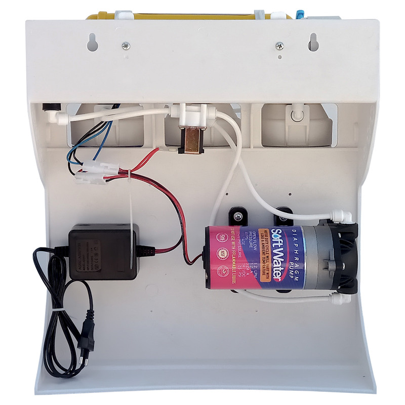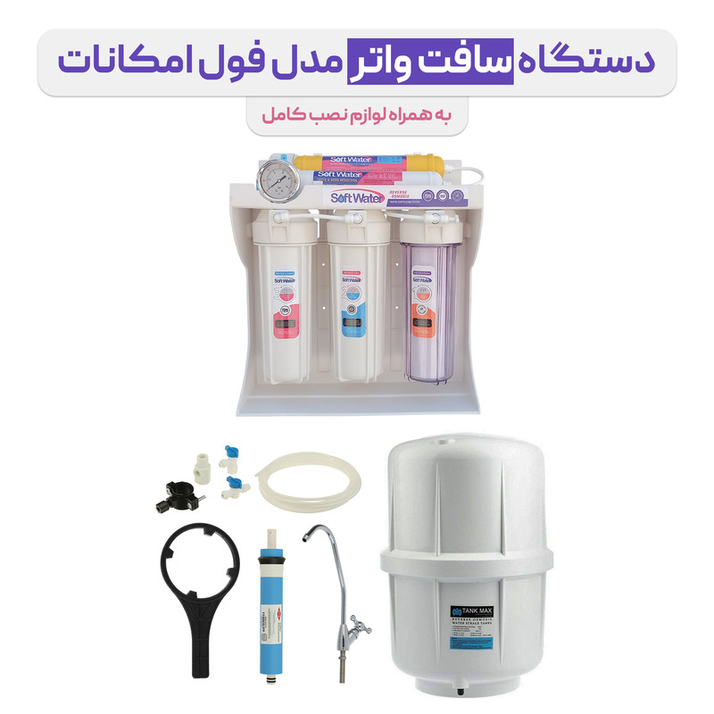 دستگاه تصفیه آب 6 مرحله سافت واتر مدل فول فیلتر یکی از دستگاه های تصفیه آب موجود در بازار است که از سیستم اسمز معکوس برای تصفیه آب استفاده میکند.مزیت مهم استفاده از سیستم اسمز معکوس این است که آلاینده های درون آب در صورت عبور از فیلتر ممبران 13 لایه RO تا 99 درصد و بیش از آن تصفیه میشوند. یکی از ویژگیهای قابل توجه این دستگاه کننده تصفیه آب مخزن4 گالنی با توان تصفیه 300 لیتر در شبانه روز است.در دستگاه تصفیه آب سافت واتر مدل فول فیلتر آب برای تصفیه از این 6 فیلتر میگذرد و همین باعث شده تا این مدل 6 مرحلهای باشد.در مرحله اول آب از فیلتر پلی پروپلین عبور میکند. این فیلتر ذرات معلق گل ولای، رسوبات ریز و زنگ زدگی را از آب حذف میکند.پس از این نوبت به فیلتر دوم میرسد. فیلتر استفاده شده در این مرحله از پوستهی تهیه شده و برای حذف کلر، اسیدهای چرب، آفتکشها وغیره مورد استفاده قرار می گیرد.مرحله سوم به نوعی تکمیل کننده مراحل 1 و 2 است. دراین مرحله تری هالومتانها و ذرات کربنی آزاد شده از مرحلهی دوم از بین میرود تا در مرحله بعدی آسیبی به ممبران وارد نشود.مرحله چهارم یا قلب دستگاه، مرحله ممبران است. این فیلتر تمامی تکنولوژی اسمز معکوس را به عهده دارد. از بین بردن کلیهی املاح و فلزات سنگین نظیر نیترات، نیتریت و ارسنیک وغیره در این مرحله صورت میگیرد. در این قسمت تمامی املاحی از آب آشامیدنی جدا میشوند.مرحله پنجم هم به فیلتری از پوست نارگیل مجهز شده که در نهایت به بهبود طعم و بو و مزهی آب کمک میکند.مرحله ششم از دستگاه تصفیه آب 6 مرحله سافت واتر، مرحله عبور آب از سنگهای معدنی تهیه شده و املاح مورد نیاز بدن مانند کلسیم، پتاسیم، سدیم و زینک به آب اضافه میکند.اقلامی که داخل جعبه است دستگاه تصفیه آب می باشد : یک دستگاه تصفیه آب 6 مرحله ای سافت واتر مدل فول فیلتر، مخزن ذخیره آب تحت فشار با حجم 4 گالن که معادل حدود 16 لیتر است ، شیر برداشت استیل فلکه ای آب (ویژه نصب روی سینک ظرفشویی) و پکینگ نصب کامل دستگاه که شامل ، آچار مخصوص تعویض فیلتر ها و شیلنگ نصب جهت شیلنگ کشی بین مخزن و دستگاه و شیر مصرف، شیر مخزن، شیر رو سینکی فلکه ای ، سه راهی اتصال شیر پیسوار به شیر ورودی ، شیر وروردی آب شهری به دستگاه ، کمربند فاضلاب جهت اتصال پساب به لوله فاضلاب می باشد.