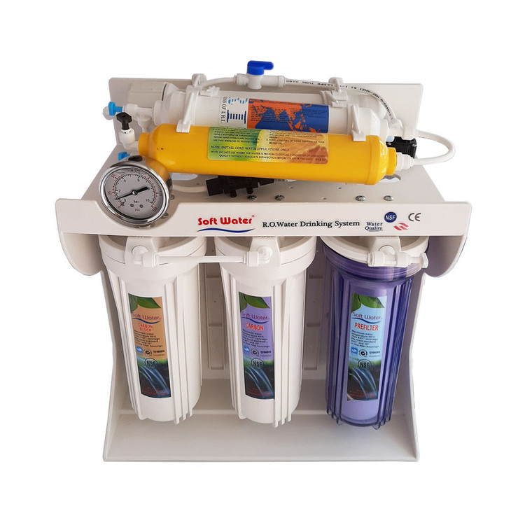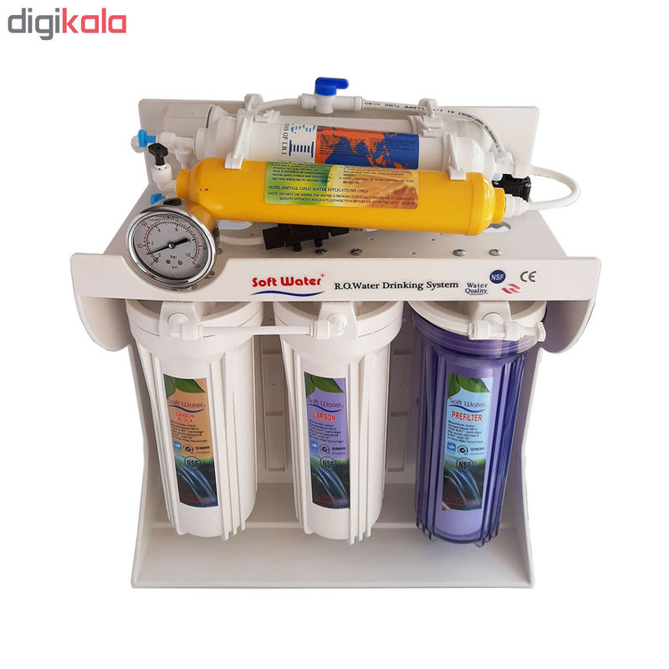 دستگاه تصفیه آب سافت واتر پیشترفته ترین و کامل ترین تصفیه آب خانگی با فناوری سیستم اسمز معکوس میباشد (RO) که در 6 مرحله و 6 فیلتر آب را تصفیه میکند که شامل فیلتر های PP و UDF و CTO و MEMBRANE و POST CARBON و MINERAL همراه با مخزن ذخیره آب 4 گالن و فیلتر ممبران 13 لایه و هوزینگ های دوبل اورینگ برای آب بندی بهتر میباشد.