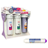 دستگاه تصفیه آب معدنی ساز به همراه مقلیایی کننده و مجهز به فیلتر محافظت از ممبران سافت واتر مدل sw-11 با اتصالات و قطعات تایوانی در مجموعه بازرگانی حاجی باشی مونتاژ شده است ، این دستگاه توسط فرایند اسمز معکوس (Reverse Osmosis System) ، می تواند هر آبی را به آب تصفیه شده ، بهداشتی و قابل شرب برای انسان با تمام استداندارد های بین المللی تبدیل کند. بزرگترین امتیاز این مدل از دستگاه تصفیه آب سافت واتر ، عدم احتیاج به حضور تکنسین جهت تعویض فیلتر ها بذلیل استاندارد بودن نوع فیلتر های آن می باشد و کلیه فیلتر های دستگاه از برترین کیفت ساخته شده است ، بنابراین این موضوع تاثیر چشمگیری در کاهش هزینه های نگهداری از دستگاه خواهد شد. از قابلیت های این دستگاه می توان به حذف کامل جرم کتری که مشکل عدیده مردم می باشد ، حذف شن ، ماسه، گل و لای، کلر، ترکیبات آلی ، رنگ ، بو ، طعم ، نیترات ، نیتریت ، آرسنیک ، کبالت ، جیوه ، سرب ، فلزات سنگین اشاره نمود. یکی از مهمترین نکات در انتخاب یک دستگاه تصفیه آب کارآمد و بهداشتی ، انتخاب دستگاهی است که تمام اجزا و قطعات آن قابل استفاده جهت تولید آب بهداشتی برای مصرف انسان باشد ، اگر قسمتی از اجزا دستگاه تصفیه آب فاقد استاندارد های بهداشتی جهت استفاده انسان باشد ، این موضوع می تواند باعث اضافه شدن مواد سمی به آب تولید شده توسط دستگاه شود ، بنابراین انتخاب در امر خرید یک دستگاه تصفیه آب استاندارد ، مهمترین گام در بهره مندی از آبی بهداشتی و گوارا است. این دستگاه دارای تاییدیه های NSF و Water Quality Association می باشد. اقلامی که داخل جعبه اسن دستگاه تصفیه آب می باشد : یک دستگاه تصفیه آب 8 مرحله ای سافت واتر مدل sw-11 ، مخزن ذخیره آب تحت فشار با حجم 4 گالن که معادل حدود 16 لیتر است ، شیر برداشت استیل اهرمی آب (ویژه نصب روی سینک ظرفشویی) و پکینگ نصب کامل دستگاه که شامل ، آچار مخصوص تعویض فیلتر ها و شیلنگ نصب جهت شیلنگ کشی بین مخزن و دستگاه و شیر مصرف، شیر مخزن، شیر رو سینکی استیل اهرمی ، سه راهی اتصال شیر پیسوار به شیر ورودی ، شیر وروردی آب شهری به دستگاه ، کمربند فاضلاب جهت اتصال پساب به لوله فاضلاب است.