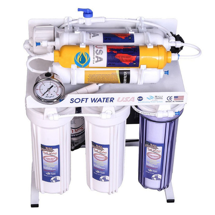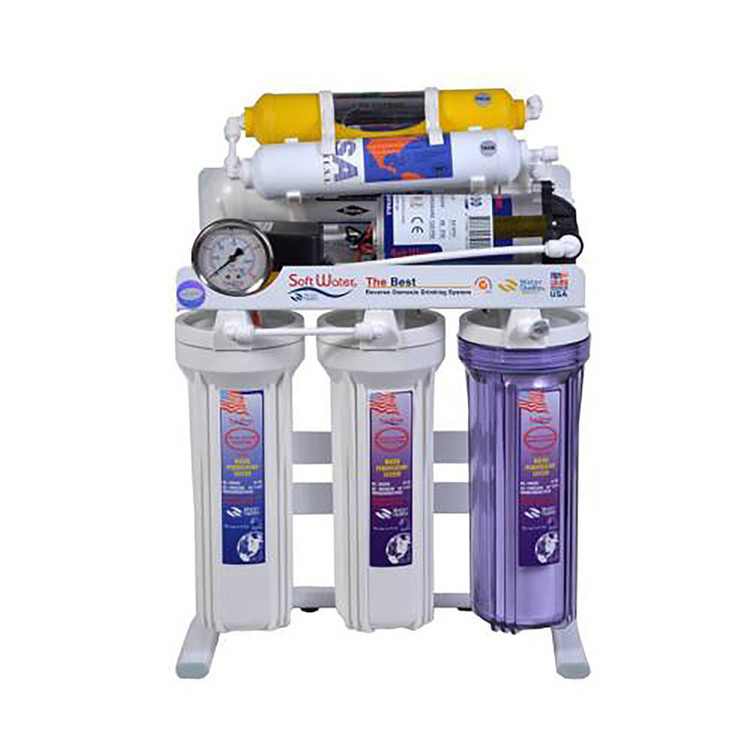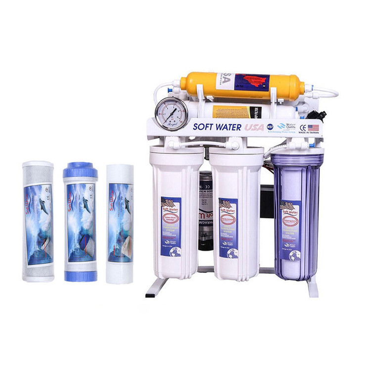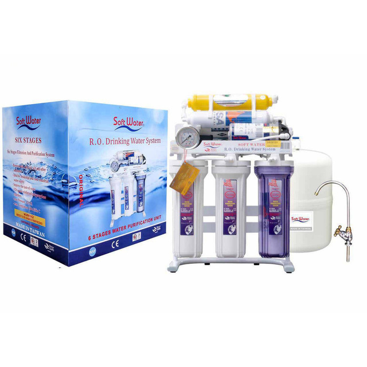 دستگاهی که علاوه بر تولید آب مصرفی ، قابلیت اتصال به همه نوع یخچال و فریزر را نیز دارد . دستگاه تصفیه آب سافت واتر مدل RO 07 توسط فرایند اسمز معکوس (Reverse Osmosis System) ، می تواند هر آبی را به آب تصفیه شده ، بهداشتی و قابل شرب برای انسان با تمام استداندارد های بین المللی تبدیل کند.بزرگترین امتیاز این مدل از دستگاه تصفیه آب سافت واتر ، عدم احتیاج به حضور تکنسین جهت تعویض فیلتر ها می باشد و کلیه فیلتر های دستگاه از برترین کیفت ساخته شده است ، بنابراین این موضوع تاثیر چشمگیری در کاهش هزینه های نگهداری از دستگاه خواهد شد. از قابلیت های این دستگاه می توان حذف شن ، ماسه ، گل و لای ، کلر ، ترکیبات آلی ، رنگ ، بو ، طعم ، نیترات ، نیتریت ، آرسنیک ، کبالت ، جیوه ، سرب ، فلزات سنگین اشاره نمود. یکی از مهمترین نکات در انتخاب یک دستگاه تصفیه آب کارآمد و بهداشتی ، انتخاب دستگاهی است که تمام اجزا و قطعات آن قابل استفاده جهت تولید آب بهداشتی برای مصرف انسان باشد ، اگر قسمتی از اجزا دستگاه تصفیه آب فاقد استاندارد های بهداشتی جهت استفاده انسان نباشد ، این موضوع می تواند باعث اضافه شدن مواد سمی به آب تولید شده توسط دستگاه شود ، بنابراین انتخاب در امر خرید یک دستگاه تصفیه آب استاندارد ، مهمترین گام در بهره مندی از آبی بهداشتی و گوارا است. این دستگاه دارای تاییدیه های NSF و Water Quality Association امریکا می باشد.اقلام زیر در داخل کارتن دستگاه موجود است. یک دستگاه تصفیه آب سافت واتر مدل 07 RO ، و مخزن ذخیره آب تحت فشار با حجم 4 گالن که معادل حدودا 16 لیتر است. شیر برداشت استیل اهرمی آب (ویژه نصب روی سینک ظرفشویی) و پکینگ نصب کامل دستگاه که شامل ، آچار مخصوص تعویض فیلتر ها و شیلنگ نصب ، شیر مخزن ، شیر رو سینکی استیل اهرمی ، سه راهی اتصال شیر پیسوار به شیر ورودی ، شیر وروردی آب شهری به دستگاه ، کمربند فاضلاب جهت اتصال پساب به لوله فاضلاب است.