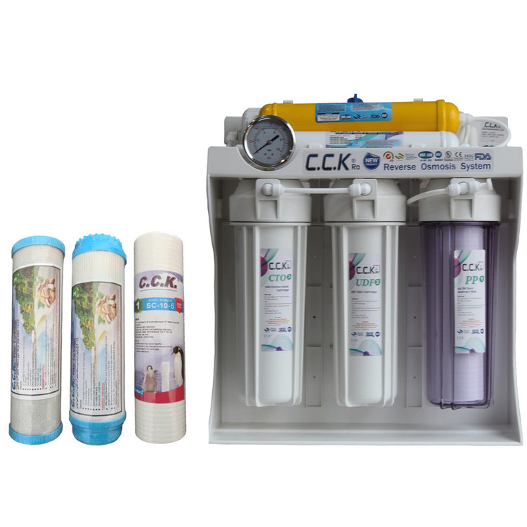 دستگاه تصفیه آب خانگی 6 مرحله ای با برند معروف و معتبر سی سی کا CCK با استفاده از پیشرفته ترین تکنولوژی روز دنیا در فرایند تصفیه آب با استفاده از ممبران RO یا اسمز معکوس می باشد. مراحل فیلتراسیون دستگاه 6 مرحله ای سی سی کا مدل Korea-edition3600 عبارتند از 3 مرحله اول پیش فیلتراسیون جهت حذف ذرات معلق مانند : گرد و خاک و گل ، زنگ آهن ، کلر ، سموم شیمیایی و رنگهای صنعتی با جرم 1 تا 5 میکرون می باشند. مرحله چهارم این دستگاه فیلتر ممبران اسمز معکوس است که جهت سختی گیری و حدف املاح محلول در آب و انواع نمک های معدنی و آلی ، مواد بیولوژیکی مانند انواع ویروس و باکتری وقارچ و پسمانده ها صنعتی تا0/0001 میکرون و حدف فلزات سنگین مانند نیترات ، نیتریت ، جیوه و کلیه عوامل سرطان زا از آب می باشد. مرحله پنجم این دستگاه فیلتر پست کربن یا کربن نهایی است که جهت حدف طعم و بوی نامطبوع آب بر روی این دستگاه طراحی و نصب گردیده است ، این فیلتر متشکل از زغال اکتیو شده پوسته نارگیل می باشد . مرحله ششم این دستگاه فیلتر مینرال یا معدنی ساز است که جهت افزودن املاح مورد نیاز بدن انسان مثل مثل کلسیم ، منیزیم ، پتاسیم ، روی ، آهن و سدیم به اندازه مورد نیاز بدن انسان به آب می باشد.مخزن تحت فشار جهت ذخیره آب تصفیه شده به شما این امکان را می دهد تا همیشه به میزان لازم آب تصفیه شده را بصورت پر فشار در اختیار داشته باشید. شیر برداشت آب تصفیه شده تمام استیل اهرمی که داخل بسته بندی این محصول قرار دارد ، براحتی آب را بر روی سینک ظرف شوئی جهت استفاده به اختیار شما قرار می دهد. بکار گیری فیلتر های مرغوب تهیه شده از مواد درجه 1 با گرید خوراکی ، هر گونه شبهه ای را برای مشتریان سخت پسند رفع کرده و آبی سالم ، بهداشتی و بدون هر گونه آلودگی را برای شما به ارمغان می آورد.سایز این دستگاه کاملا مطابق با استاندارد کابینت های ایرانی است.