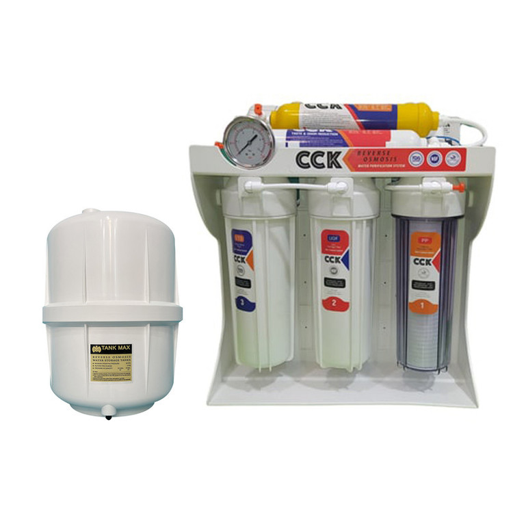 دستگاه تصفیه آب 6 مرحله ای سی سی کا مدل RO6-CCK یکی از محبوب ترین دستگاه های تصفیه آب خانگی است که با 6 مرحله تصفیه کامل با تصفیه کنندگی 99.9 درصدی املاح محلول در آب با قطر 1 تا 5 میکرون که علاوه بر حذف شوری آب ، مشکل بوی نامطبوع آب ، کلر موجود در آب ، و حذف کامل جرم کتری را بدرستی انجام می دهد . این دستگاه علاوه بر دارا بودن فیلتر ممبران جهت کاهش سختی آب ناشی از انواع ویروس و باکتری ، قابلیت معدنی کنندگی را هم دارد . به این صورت که با اضافه کردن مواد معدنی مفید برای بدن انسان به میزان مورد نیاز ، باعث می شود تا همیشه آبی را نوش جان بفرمائید که مقادیر متناسبی از انواع مواد معدنی مانند : پتاسیوم ، روی ، آهن و فسفر را در طول روز و فقط با نوشیدن آب در یافت نمائید . یک شیر برداشت اهرمی استیل جهت نصب روی سینک نیز به همراه این دستگاه ارائه می گردد . مخزن تحت فشار دستگاه تصفیه آب سی سی کا مدل RO6-CCK به شما کمک می کند که علاوه تحویل آب با فشار مناسب روی سینک ، در مواقعی مانند قطع برق ، حدود 8 لیتر آب شرب ذخیره شده داشته باشید .