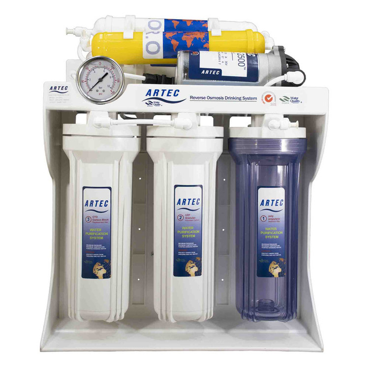 دستگاه تصفیه آب خانگی آرتک مدل RO-W620 یک محصول با کیفیت ایرانی است که آب مصرفی را طی 6 مرحله فیلتر می کند و اب تصفیه شده و با کیفیتی را در اختیار مصرف کننده قرار می دهد. در بسته بندی این محصول آب تصفیه کن ایرانی یک دستگاه اسمز معکوس که در ادامه به تفصیل درباره آن صحبت می کنیم، به همراه یک عدد شیر ستاره ای بزرگ، یک مخزن 4 گالن تحت فشار، 6 عدد فیلتر، سه راهی شیر ورودی، 6 متر شلنگ، یک عدد آچار هوزینگ و شیر مخزن قرار دارد. با خرید این دستگاه تصفیه آب، دیگر نیاز به تهیه کردن لوازم و قطعات دیگری برای استفاده نیست و تمامی لوازم مورد نیاز در پک همراه این دستگاه تصفیه آب قرار دارد. دستگاه تصفیه آب آرتک قادر است در روز 200 لیتر آب را تصفیه کند. از نظر کیفیت تولید آب شیرین تفاوتی با محصولات تایوانی ندارد. از نظر اقتصادی کاملا ارزان و به صرفه می باشد. یک عدد گیج فشار بزرگ روی این سیستم تصفیه آب 6 مرحله نصب شده است.