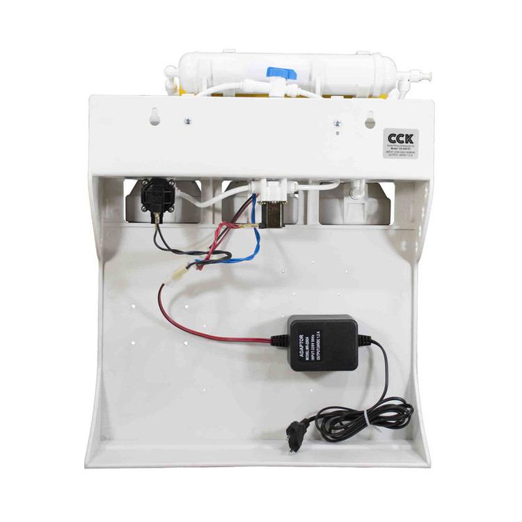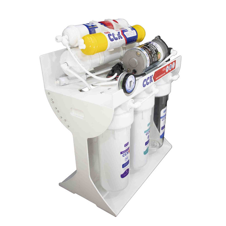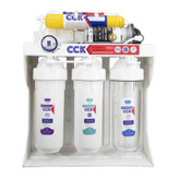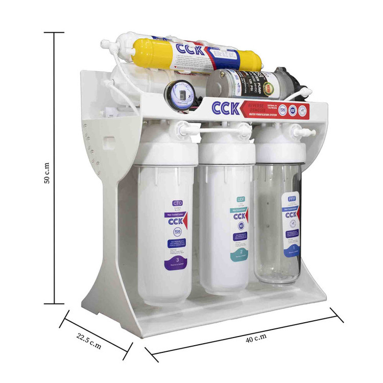 دستگاه تصفیه آب خانگی سی سی کا مدل RO-WW600 یک محصول ایرانی تایوانی بسیار با کیفیت می باشد. این سیستم تصفیه آب دارای 6 مرحله بوده و به بهترین شکل ممکن قادر است آب مصرفی را تصفیه و آب سالم و با کیفیتی را در اختیار مصرف کننده قرار دهد. دستگاه تصفیه آب 6 مرحله CCK مدل RO-WW600 را می توان جزو برترین سیستم های خانگی توس فیلتر به شما آورد. این سیستم تصفیه آب خانگی هم از نظر کیفیت تولید آب شیرین بی نظیر و همینطور از نظر کیفیت فیزیکی جزو محصولات برتر می باشد. دستگاه تصفیه آب سی سی کا RO-WW600 دارای 6 فیلتر می باشد که به ترتیب عبارتند از: فیلتر الیافی، فیلتر گرانول کربن، فیلتر کربن بلاک، فیلتر ممبران RO، فیلتر پست کربن، فیلتر مینرال تصفیه آب. هر کدام از این فیلتر ها وظیفه خاص خود را دارد. به همراه این سیستم تصفیه آب خانگی، یک مخزن 4 گالن تایوانی، شیر نیمه اهرمی، فیلترهای دستگاه تصفیه آب، سه راهی شیر ورودی، 6 متر شلنگ، آچار هوزینگ و شیر مخزن نیز در بسته بندی قرار دارد. با خرید این سیستم تصفیه آب دیگر نیازی به تهیه قطعه یا محصول دیگری ندارید و تمامی قطعات مورد نیاز برای نصب و راه اندازی دستگاه، در بسته بندی آن قرار دارد. سیستم تصفیه آب ایرانی سی سی کا قادر است روزانه 200 لیتر آب شیرین را تولید کند. روی براکت این دستگاه تصفیه آب یک عدد کیت هشدار دهنده تعبیه شده که هر 6 ماه یکبار این آلارم به صدا در می آید و زمان تعویض فیلتر را به مصرف کننده اعلام می کند. صدای این کیت دیجیتال بسیار آرام بوده و فقط افرادی که به فاصله حداکثر دو سه متری آن قرار داشته باشند صدای آن را خواهند شنید. این کیت می تواند در حفظ سلامت دستگاه تصفیه آب بسیار موثر و مفید باشد.