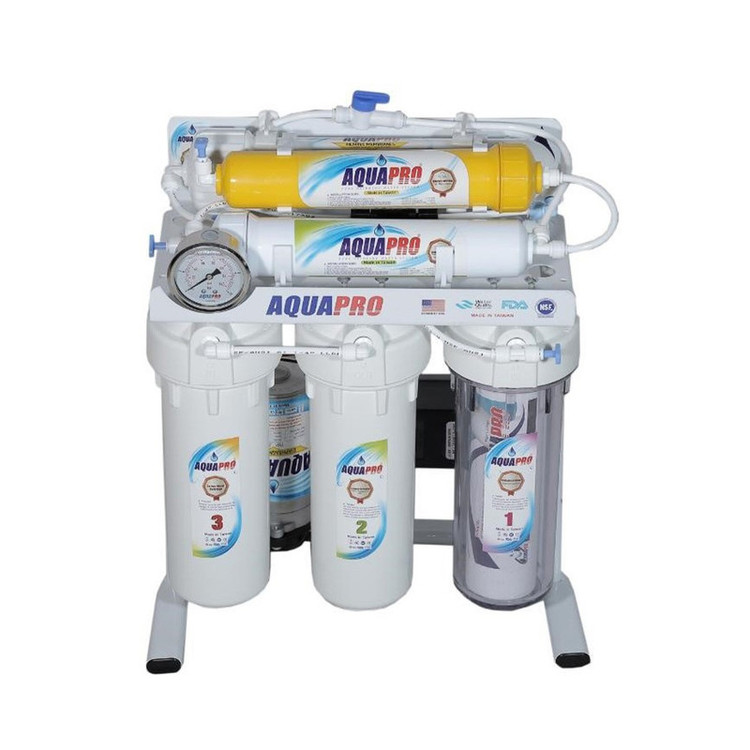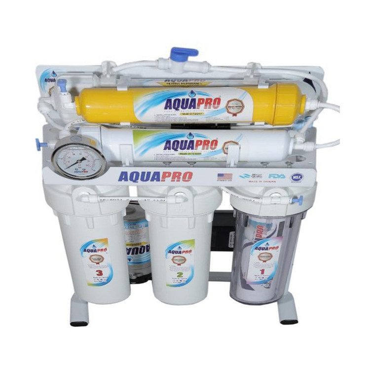 این دستگاه جزء بهترین نوع دستگاه تصفیه آب خانگی با کیفیت برتر و بهترین سیستم تصفیه آب خانگی RO اسمز معکوس میباشد. برند آکوا پرو AQUA PRO ساخت کشور تایوان تحت لیسانس آمریکا و تصفیه آب طی 6 فیلتر و 6 مرحله و همراه با فیلتر ممبران 13 لایه آمریکا مخزن 4 گالن (16 لیتری) _ گیج فشار بزرگ _ پمپ 125psi _ هوزینگ های اورجینال ، همراه با شیر اهرمی برای برداشت آب تصفیه شده می باشد.