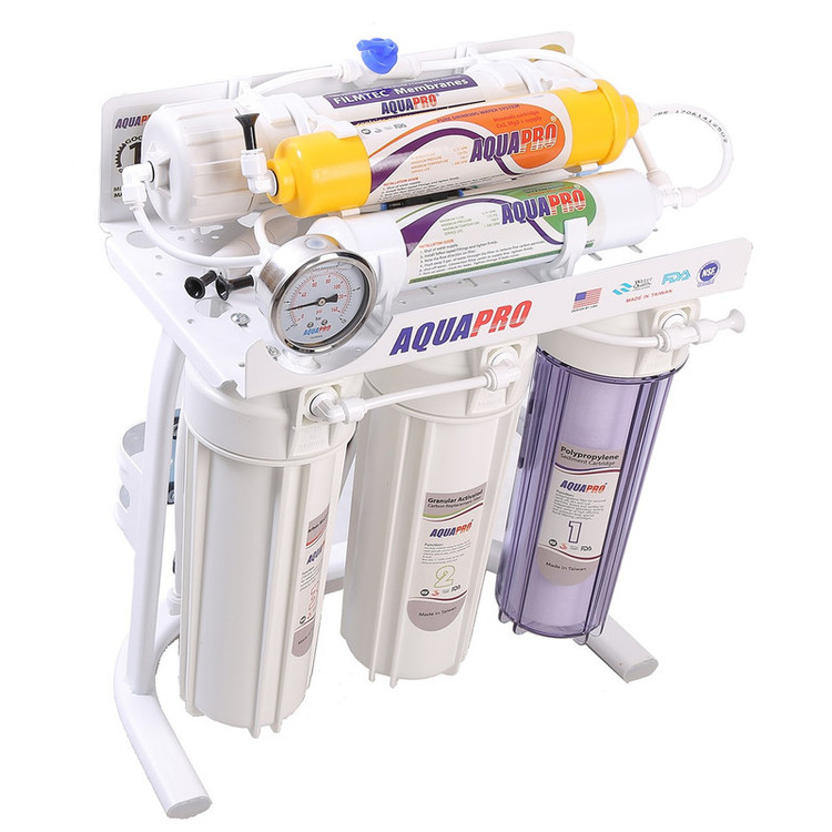 این دستگاه جزو بهترین نوع دستگاه تصفیه آب خانگی با کیفیت برتر و بهترین سیستم تصفیه آب خانگی RO اسمز معکوس میباشدبرند آکوا پرو AQUA PRO ساخت کشور تایوان تحت لیسانس آمریکا و تصفیه آب طی 6 فیلتر و 6 مرحله و همراه با فیلتر ممبران 13 لایه آمریکا مخزن 4 گالن (16 لیتری) _ گیج فشار بزرگ _ پمپ 125psi _ هوزینگ های دوبل اورینگ برای آب بندی بهتر و همراه با شیر اهرمی برای برداشت آب تصفیه شدهقدرت پایین آوردن سختی (TDS) آب و همچنین تنظیم PH آب و از بین بردن فلزات سنگین نیترات و نیتریت و حذف کلیه ناخالصی های آب تا 0/0001 میکرونقابلیت نصب به ساید و قابل جابجایی آسان دارای استاندارد های جهانی FDA _ WATER QUALITY _ CE _ NSFآب شیرین کن _ در مناطقی که مشکل شوری آب دارند قدرت شیرین کردن آب را داراست و برقی (24 ولت) _ قابلیت نصب به ساید را دارد و قابل جابجایی آسان