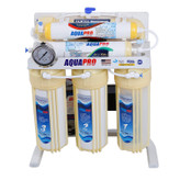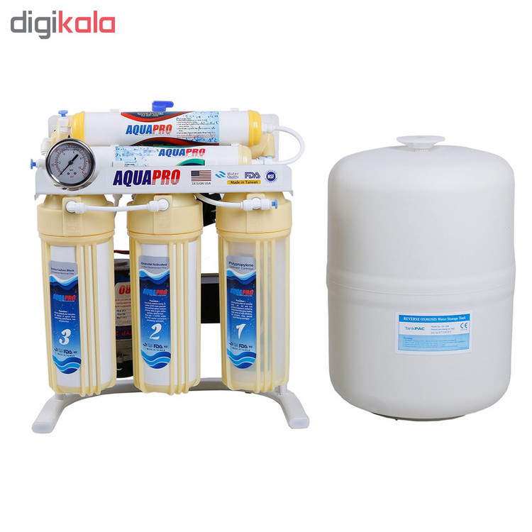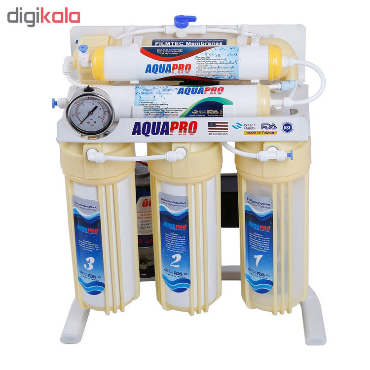 تصفیه آب خانگی AQUA PRO مدل RO6-Y اسمز معکوس در نوع خود عالی است که با سیستم تصفیه سختی گیر آب و حذف کلیه املاح مضر تا 99% و حذف نیترات و نیتریت و تنظیم PH آب سالم و گوارا را در اختیار شما قرار میدهد، تصفیه کننده آب آکوا پرو با بهترین قطعات و فیلترهای با کیفیت تایوان تهیه شده است که قدرت حذف کلیه ناخالصی های آب تا 0.0001 میکرون دارد با برق (24 ولت) کار میکند و قابلیت نصب به ساید و قابل جابجایی آسان را دارد که با یک شیر اهرمی شیک که بر روی گوشه سینک نصب میشود آب تصفیه شده را به شما تحویل میدهد این دستگاه دارای استاندارد های جهانی FDA _ WATER QUALITY _ CE _ NSF دستگاه تصفیه آب خانگی آکوا پرو مدل RO6-Y در طی شش مرحله و با شش فیلتر مجزا تصفیه را انجام میدهد که مراحل و فیلترهای این دستگاه را میتوانید در قسمت مشخصات بررسی کنید، نکته قابل توجه دیگر این دستگاه فیلتر ممبران پر قدرت 13 لایه با عمر بسیار بالا و مخزن 4 گالن (16 لیتری) آنتی باکتریال است و هوزینگ های دابل اورینگ برای آب بندی بهتر و پمپ پر قدرت 125psi بدون صدا و لرزش است، دستگاه در زیر سینک آشپزخونه نصب میشود و نصف کمتر زیر سینک را فضا میگیرد.